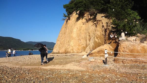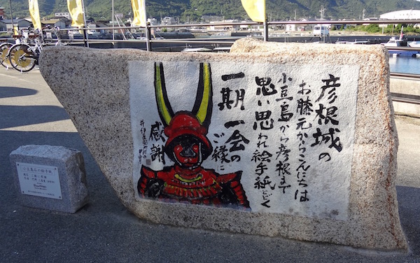 エンジェルロードに向かうも駐車場はすでに満車。すごい人気だなぁ。駐車場にも小豆島石の絵手紙があった。こちらは「ご縁に感謝」という題名で、「彦根城のお膝元からこんにちは。小豆島から彦根まで思い思われ絵手紙とどく。一期一会のご縁に感謝」と書いてあり、井伊直弼所用の甲冑が描かれている。