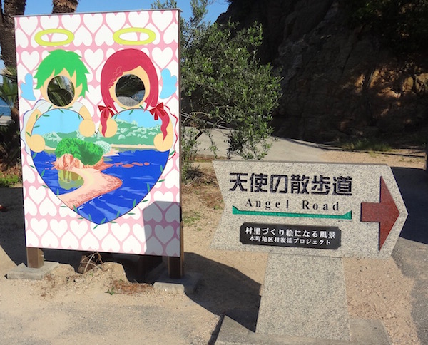 天使の散歩道(エンジェルロード)と書かれている。観光地にある穴あきパネルもあった。