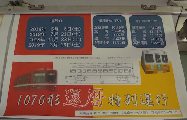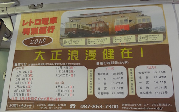 翌朝は瓦町駅からことでんに乗る。車内には大正浪漫健在!とレトロ電車の特別運行の案内があった。琴平線を走っているようだ。今日も走っているが私たちとは時間が合わない。