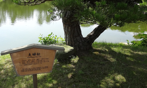 これは夫婦松。赤松(雌松)の幹の下から黒松(雄松)の枝が張り出しているためこのように呼ばれている。