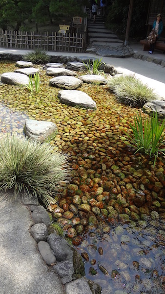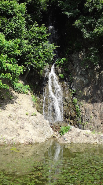 さらに進み、日暮亭で抹茶をいただいた後、こちらの桶樋滝を見学。人工の滝でポンプで水をくみ上げているとか。