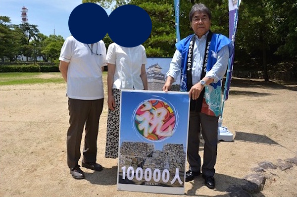 10万人目の署名を行ったのは、夫と一緒に神奈川県から観光で訪れた●●さんです。「高松城の復元を進める市民の会」から記念品が贈られました。
