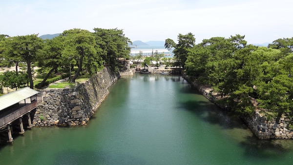 天守台からの眺め。海が近く、堀は海水だったようだ。鯛がお堀を泳いでいるらしい。