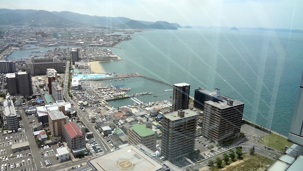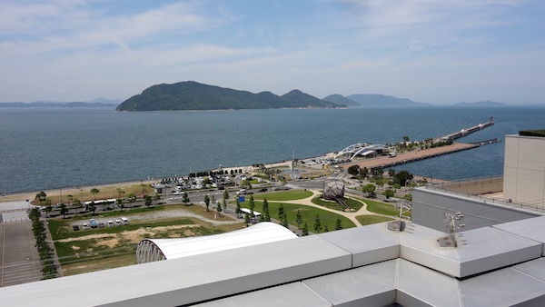 高松発の快速マリンライナーまで、まだ少し時間があるので、サンポート高松の展望台へ上る。正面に女木島がみえる。