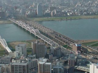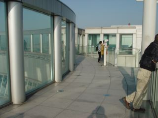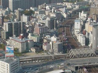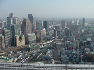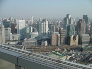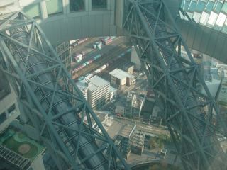 そこからはシースルーエスカレーターでの移動となる。エスカレーターからも景色が見られるようになっているのだ。そこからは普通のエスカレーターと階段で展望台に出る。展望台は円形になっていて遮るものは何もない。もちろん柵があり万が一転落しても下段でとどまるようになっている。円形なので文字通り360度の景色が眺められる。阪急電鉄梅田駅からは、京都線・宝塚線・神戸線が並んで淀川を橋で渡る様子が手に取るようにわかる。高層ビルも多いし、JRの線路もジオラマのように見ることができる。観光客も韓国か中国かわからないがアジア系の人に人気があるようだ。