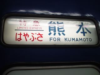東京駅では先頭車両がホームをはみ出ていたためヘッドマークが見られず、広島駅で撮影した。なるほど「はやぶさ/富士」となっている。先頭よりの1〜6号車は“はやぶさ”なので方向幕は「熊本」、後方の7〜12号車は“富士”なので方向幕は「大分」である。
