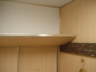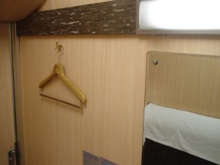 通路側の上段には荷物置き場がある。室内に落ちないようにかなり傾斜がついている。ハンガーもポツリとある。