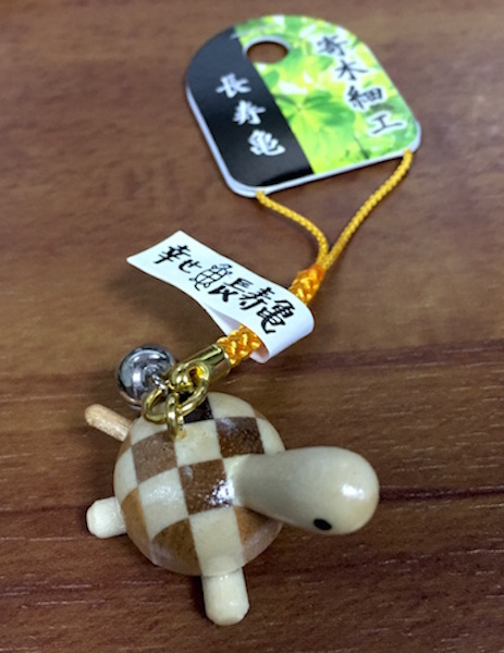 座れないので売店を見ていると、箱根細工を模した亀ストラップを発見! 迷わずに購入した。