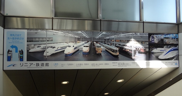改札口へ向かう階段には「リニア鉄道館へ徒歩2分」と表示されている。