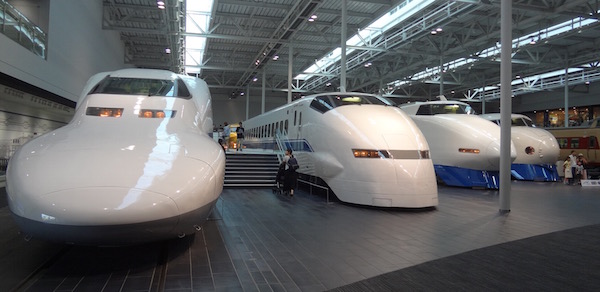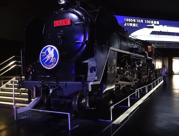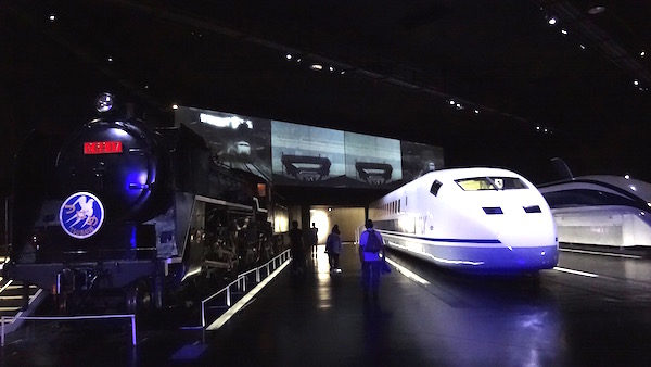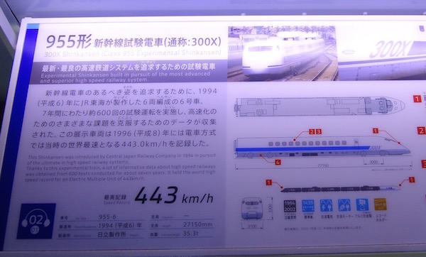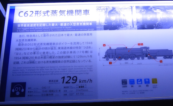 最初はシンボル展示がある。これは蒸気機関車のC62、新幹線試験車両で時速443kmを記録した300X、リニア新幹線車両のMLX01-1が展示されている。いずれも時代を象徴する車両たちである。