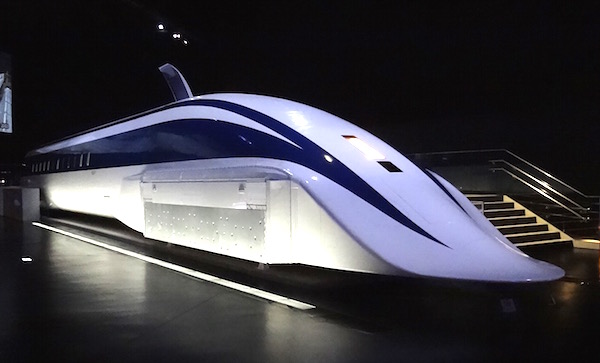 車両に搭載した超電導磁石と地上に設置したコイルとの間に生じる磁力で車体を浮上させて走る超電導リニア。