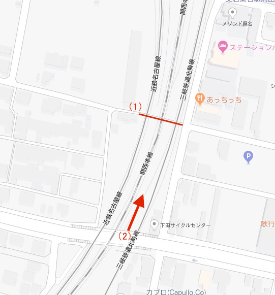 何も7年前の感傷に浸るためにここに来たわけではなく、本当の目的はこの先にあるのだ。それは3種の幅の線路の踏切(西桑名第2号踏切道)である。この地図の(1)の場所である。三岐鉄道北勢線はナローゲージ(762mm)、JRは狭軌(1067mm)、そして近鉄は標準軌(1435mm)である。踏切入口からはわかりにくいが、眺望できる場所(地図の(2))があった。