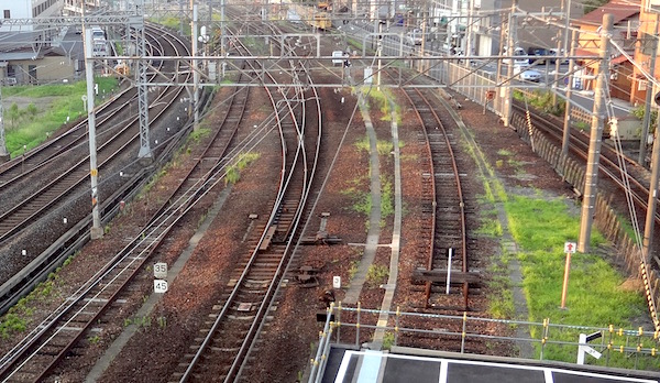 それは近くの三崎跨線橋からの眺めである。赤い矢印のうち、一番右がナローゲージ、真ん中が狭軌、一番左が標準軌となる。