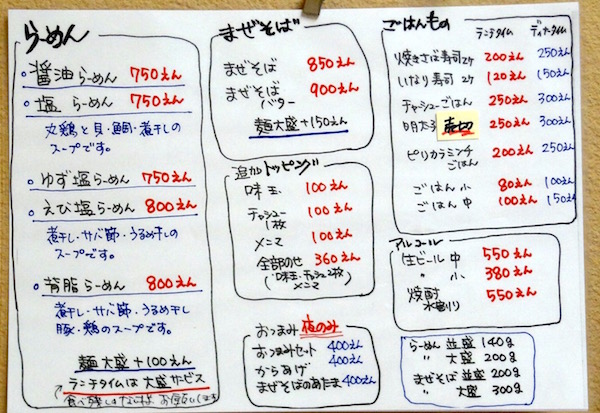 このお店、以前はお寿司屋さんだったが、現在はラーメン店となっており、そのためメニューには寿司もある。メニューは、醤油らーめん750、塩らーめん750(丸鷄と貝・鯛・煮干)、ゆず塩らーめん750、えび塩らーめん800(煮干・サバ節・うるめ干し)、背脂らーめん800(煮干・サバ節・うるめ干し・豚・鶏)、まぜそば850、まぜそばバター900、焼きさば寿司、いなり寿司など。