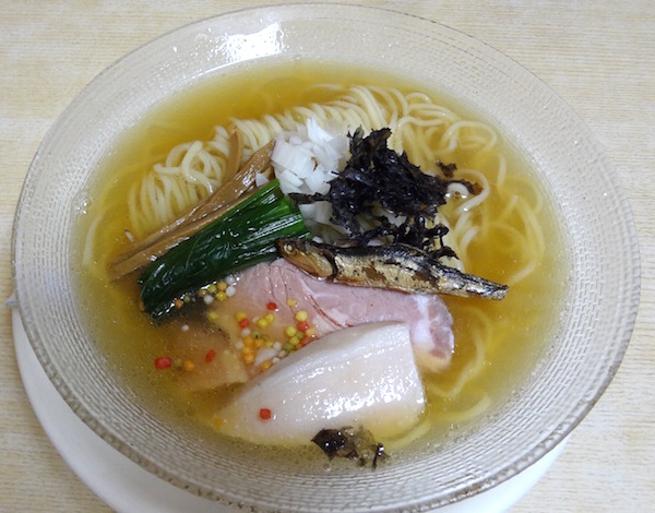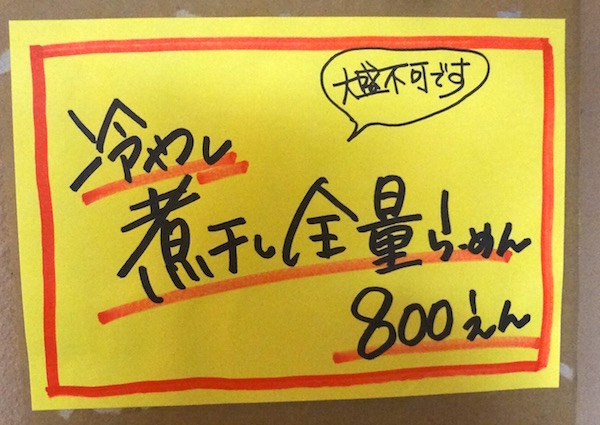 煮干だけでダシをとった煮干全量らーめんが食べたかったが、これは期間限定で今はやってないとのこと。そのかわりに、「冷し」煮干全量らーめんを勧められた。素直な私はその勧めに従い、冷し煮干全量らーめんを注文した。
