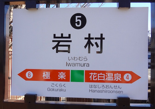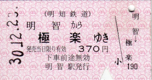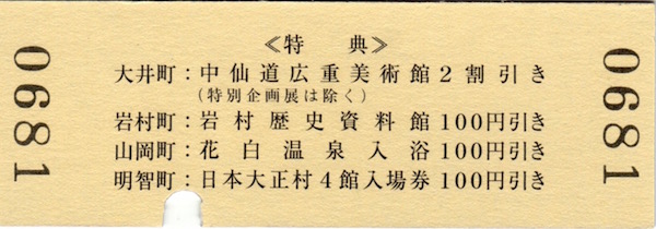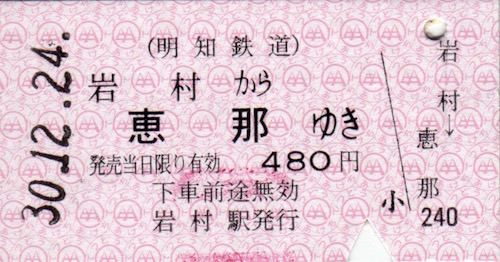 明智駅から岩村駅までの切符を購入。次の極楽駅までと料金が同じため、極楽行きとなっています。まるで本当の極楽へ行けるようですね(笑)