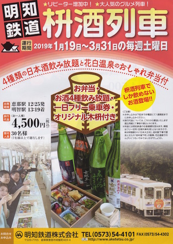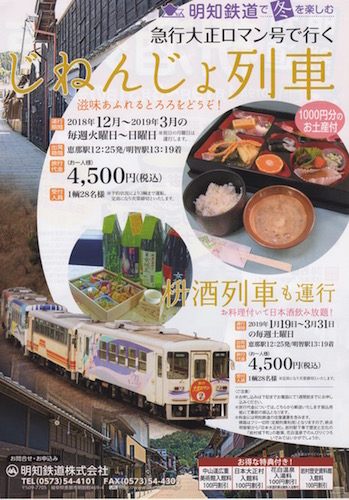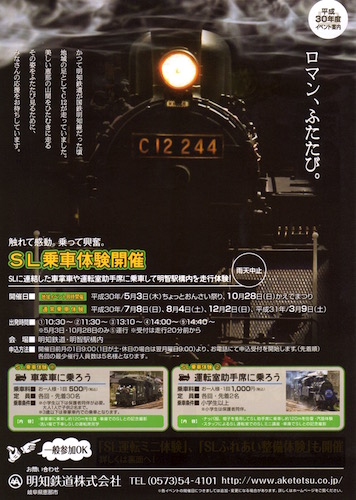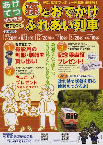 明知鉄道では「じねんじょ列車」、「枡酒列車」、「孫とおでかけふれあい列車」などのイベント列車が運行されており、また「SL乗車体験」も開催されています。工夫を凝らしていることがよくわかります。