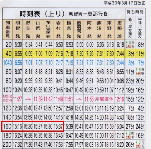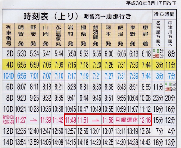 岩村で昼食を食べてから12時57分発の列車で恵那へ向かう予定であったが、1本前の列車で恵那へ向かい恵那駅近くで昼食を食べようということになった。11時49分発の列車(急行大正ロマン2号)には「月曜運休」の文字が! 今日は祝日の月曜日だ。