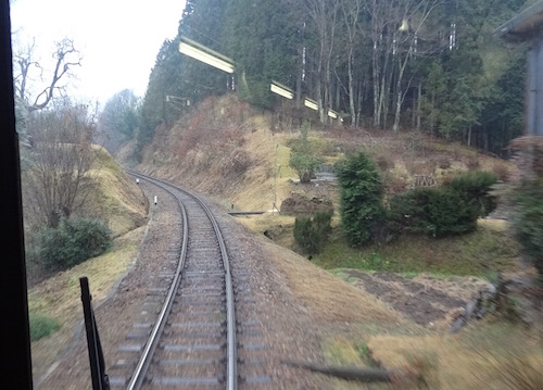 右側から中央本線が迫ってくるともうすぐ恵那駅に到着する。(最後尾から撮影)