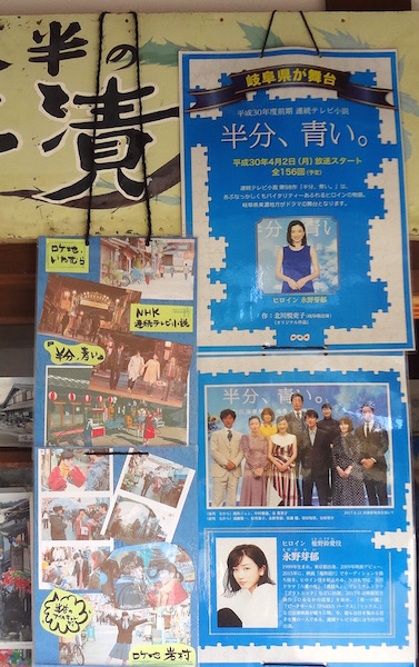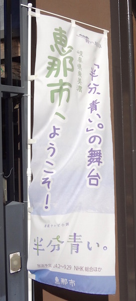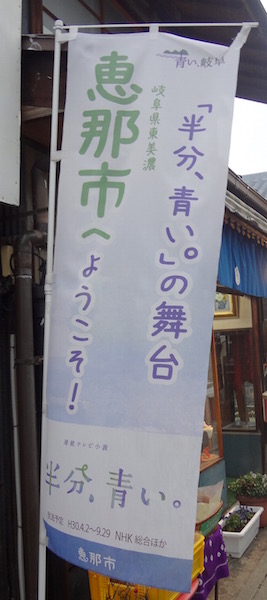 「半分、青い」の舞台 恵那市へようこそ! の幟が町のいたるところにある。町おこしへの盛り上がりがわかる。