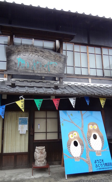 「岩邑カステーラかめや」の看板と「ようこそふくろう商店街」という穴あきパネルがあった。ドラマの中ではふくろう商店街の設定になっていたようだ。
