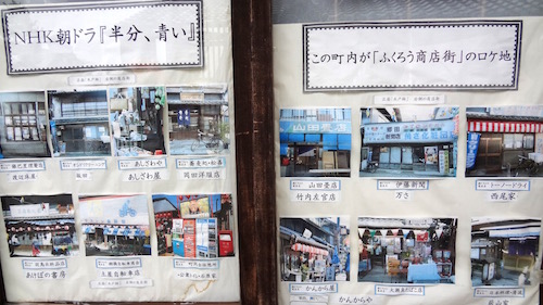 実際のお店とドラマの設定とが比較してあった。渡辺床屋は「銀巴里理髪店」、坂田は「オシドリクリーニング」、岡田洋服店は「蕎麦処松善」、あけぼの書房は「羽鳥衣料品店」、土屋自転車店は「棚橋自転車商会」、竹内左官店は「山田畳店」、万さは「伊藤新聞」、西尾家は「ノーノードライ」、かんからやは「大瀬良たばこ店」、荻山家は「日本料理 清流」という具合である。