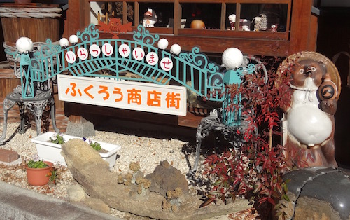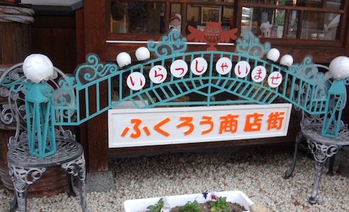 さらに進んでいくと「いらっしゃいませ ふくろう商店街」というモニュメントがあった。実際に撮影に使ったのだろうか?