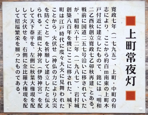 寛政7年(1795)、上町・中町の有志により、ここから約100m南東の上町木戸付近に建立したもので、銘には「明和二乙酉秋創立寛政七乙秋再建」とある。戦前に国道257号沿いに移されていたが、昭和62年(1987)、岩村城創築800年を機にここに移された。城下町は江戸時代に度々大火に見舞われたことから、火伏せ(神仏の力により火災を防ぐこと)を祈願して建立したと伝えられる。正面に大神宮(伊勢神宮)を配して天下泰平を、左側に秋葉大権現を配して火伏せを、右側に金比羅大権現を配して招福繁栄を願ったものである。