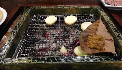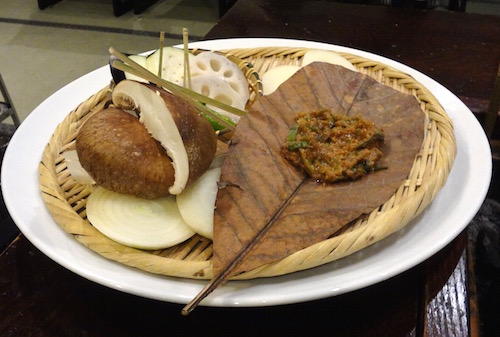棒葉に乗った味噌も囲炉裏で焼いてから野菜につけて食べるように言われた。