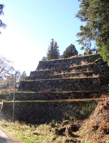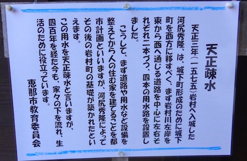 天正3年(1575)岩村へ入城した河尻秀隆は、城下町形成のために城下町を西方に移すべく、まず岩村川左岸を東から西へ通じる道路を中心に左右それぞれ2本ずつ、4本の用水路を設置しました。
