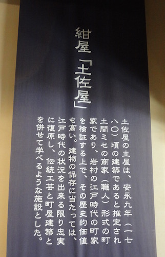 土佐屋の主屋は、安永9年(1780)頃の建築であると推定され土間ミセの商家(職人)形式の町家であり、岩村の江戸時代の町家を検証する上で、その歴史的価値も高い。建物の保存に当たっては、江戸時代の状況を出来る限り忠実に復元し、伝統工芸と町屋建築を併せて学べるような施設とした。