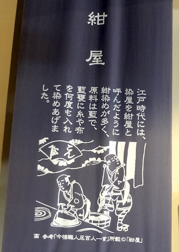 江戸時代には染屋を紺屋と呼んだように、紺染めが多く原料は藍で、藍甕に糸や布を何度も入れて染めあげました。