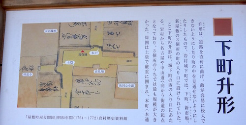 升形は、道路を直角に曲げ、敵が容易に侵入できないようにしたり町の中を見通せないようにしたりしたもので、岩村城下町では、下町、新市場、新屋敷の3箇所の町の入り口に設けられていた。