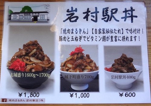 駅舎内のキッチンゆらでホットコーヒーを飲む。ここでは写真のような岩村駅丼を食べることもできる。岩村駅丼は400gで600円、城下町盛りは700gで1,000円、お城盛りは1600-1700gで1,800円となっている。お店の女性に「お城盛りを食べ切る人はどのくらいいるのですか?」と尋ねると、壁に貼られた写真を指差し、「この写真の方々はお城盛りを食べ切った人たちです」ということだった。写真をみると、かなりがっしりした人が多かった。