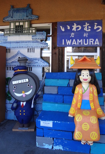 ホームには岩村駅名標、岩村城天守閣、石垣、女城主、てつじぃなどが出迎えてくれていた。