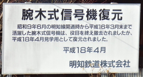 昭和9年6月の明知線開通時から平成16年3月末まで活躍した腕木式信号機は、役目を終え撤去されましたが、平成18年4月見学用として復元されました。