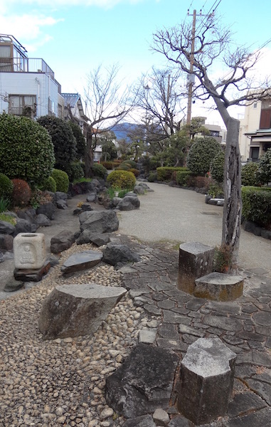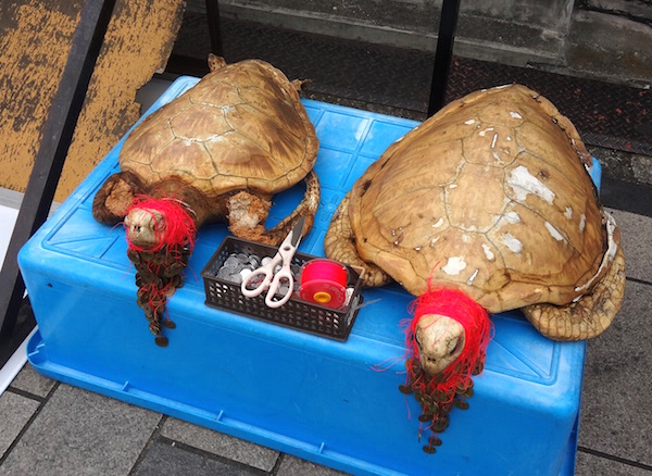 食後に店を出るとこんな亀に気がついた。五円玉を結んだ赤い糸が首に数多くかかっている。