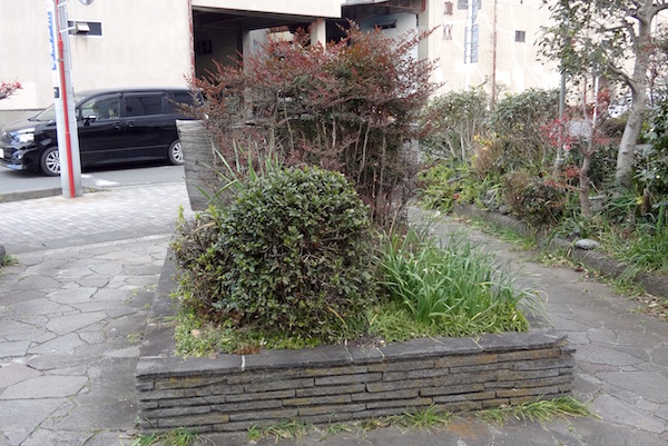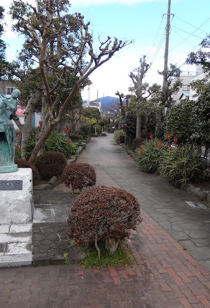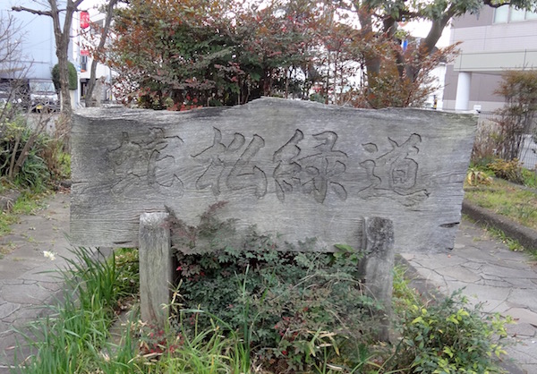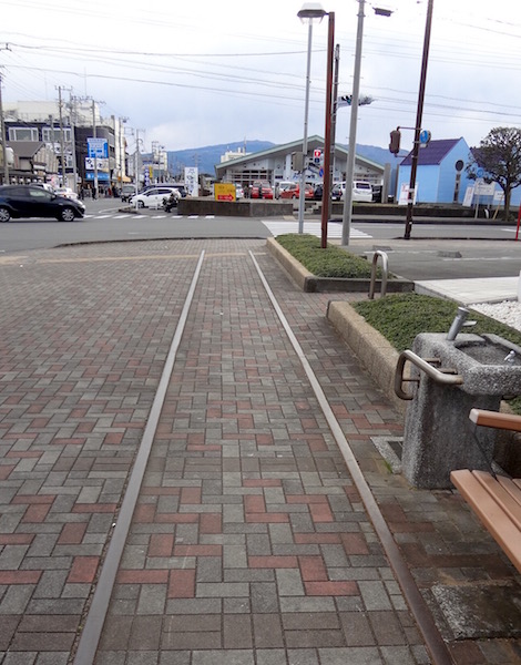 帰りのバスまでまだ時間があるので、Sさんと二人で蛇松線(通称沼津港線)の廃線跡を見に行きましょうということになり、沼津港から交差点を渡った歩道にある線路跡の場所にやってきた。上の地図の(1)の場所である。蛇松線は東海道本線の沼津駅から沼津港までを結んでいた貨物専用線で、1888年(明治21年)に開業し、1974年(昭和49年)に廃止された。