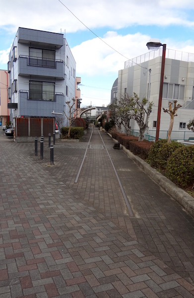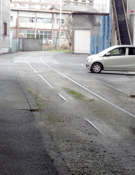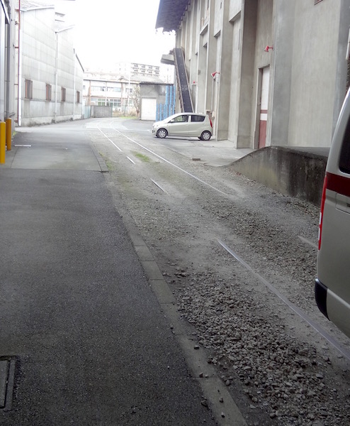 道路を渡り二つの建物の間をよくみると、、、、、車の下と向こう側にレールらしき構造物が見えた。