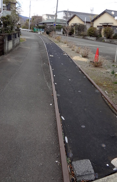 慎重に進んでみると舗装されていない部分に線路がくっきりと残っている。
