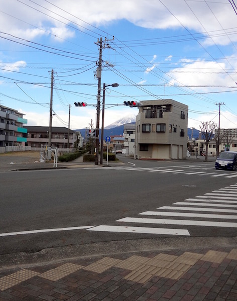 地図の(5)の場所に着いた。信号機の向こうに富士山が見える。Sさんと二人で「ここまできたら沼津駅まで歩いてみよう」ということになった。