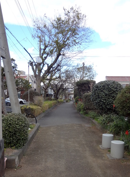 しばらくすると線路はなくなり、その線形に沿って歩道と緑地になっていた。地図の(4)あたり。