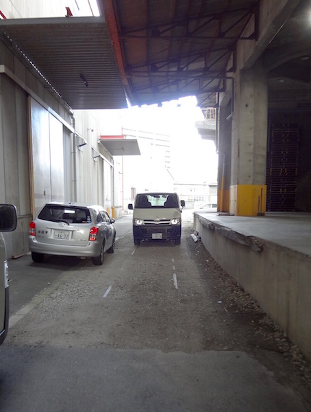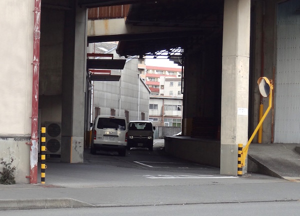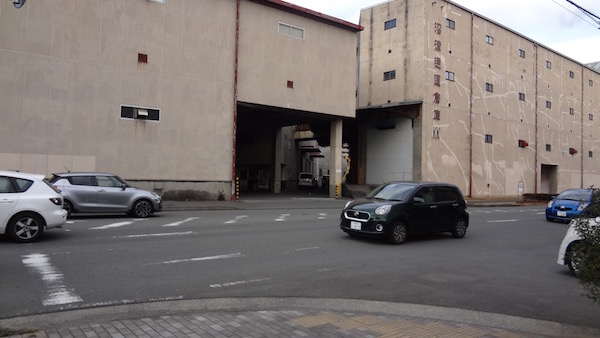 廃線歩きもここまでだろうと思い沼津駅へ行こうとするが、道路の向こう側に何か続きがありそうだ。倉庫の建物が道路に対して垂直ではなく斜めになっている。地図の(11)あたり。
