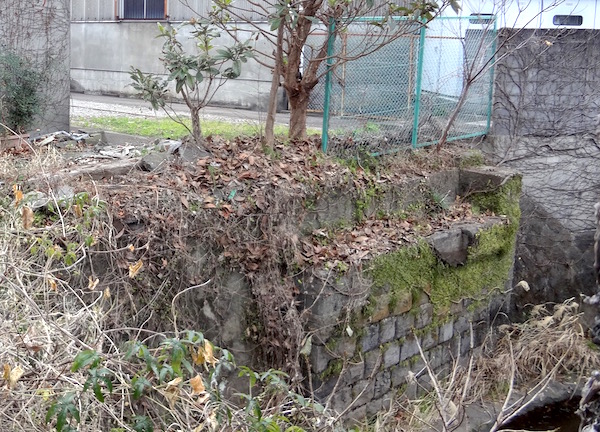 フェンスの向こう側に回ってみた。ちょうど駐車場だったので都合がよい。すると途切れた線路とともに橋脚の一部が残っているのがわかった。小さな興奮状態である(笑)。地図の(13)の場所。