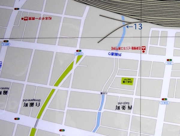 近くの地図ではこうなっている。地図の(13)の場所が橋脚があった場所である。