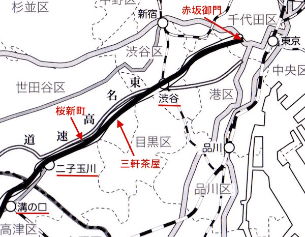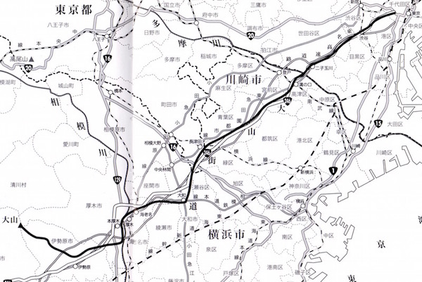 しばらく中断していた「大山みち歩き」を再開しよう。今回は大山みちの中でも江戸と伊勢原・大山を結ぶメインルートとも言うべく、赤坂御門から矢倉沢往還を通っての大山へ行くルートである。上記地図では太線で示されており現在の国道246号線にほぼほぼ沿っている。