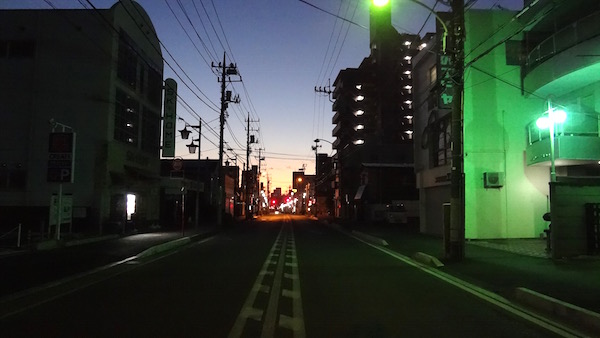 自宅を出てすぐ。まだ夜は明けない。淡く空が輝いているだけである。