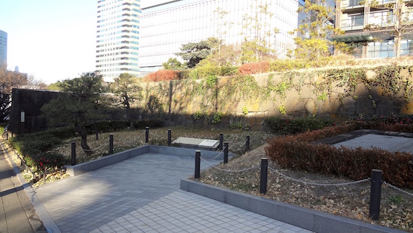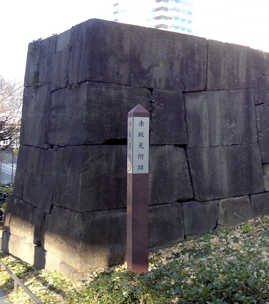 正面にある石垣は、江戸城外郭門のひとつである赤坂御門の一部で、この周辺は「江戸城外堀跡」として国の史跡に指定されています。江戸城の門は、敵の進入を発見する施設であるため「見附」とも呼ばれ、ふたつの門が直角に配置された「枡形門」の形式をとっています。赤坂御門はその面影をほとんど残していませんが、現在でも旧江戸城の田安門や桜田門には同じ形式の門をみることができます。