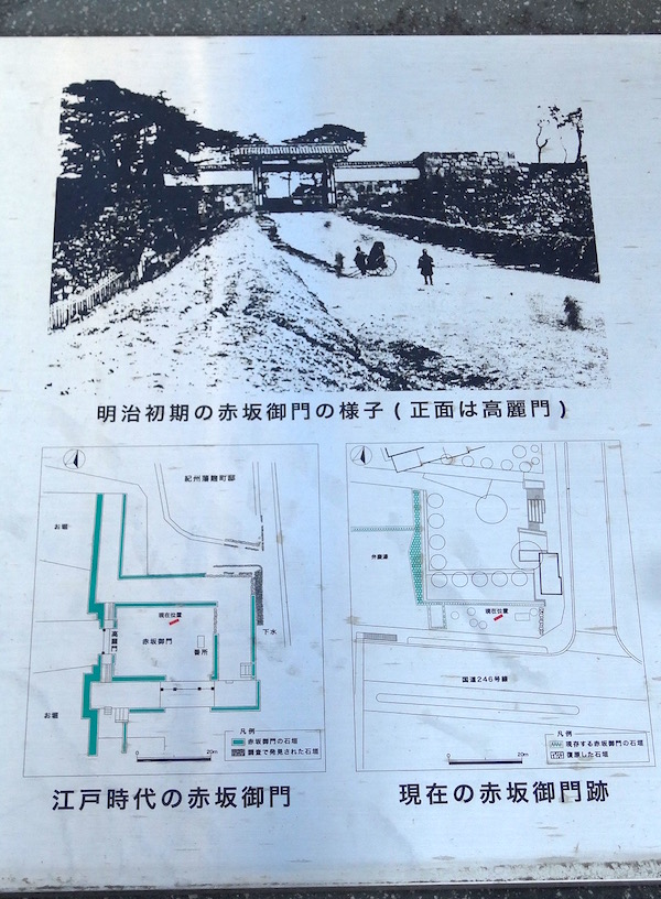 赤坂御門は、寛永13年(1636)に筑前福岡藩主黒田忠之により、この枡形石垣が造られ、同16年(1639)には御門普請奉行の加藤正直・小川安則によって門が完成しました。江戸時代のこの門は、現在の神奈川県の大山に参拝する大山道の重要な地点でもありました。