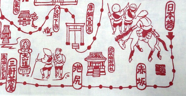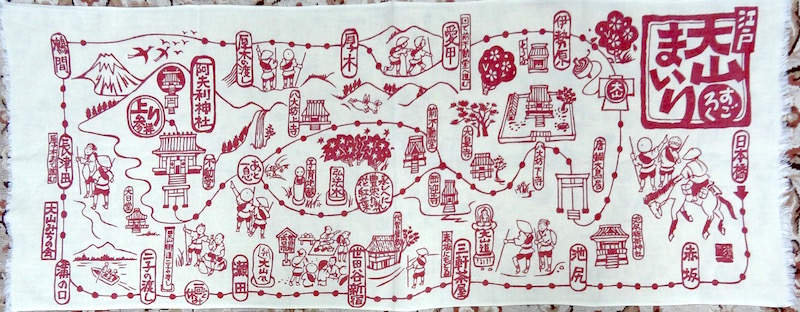 大山まいりすごろくをデザインした手ぬぐいがある。これではスタートは日本橋になってあり赤坂は通過点である。
